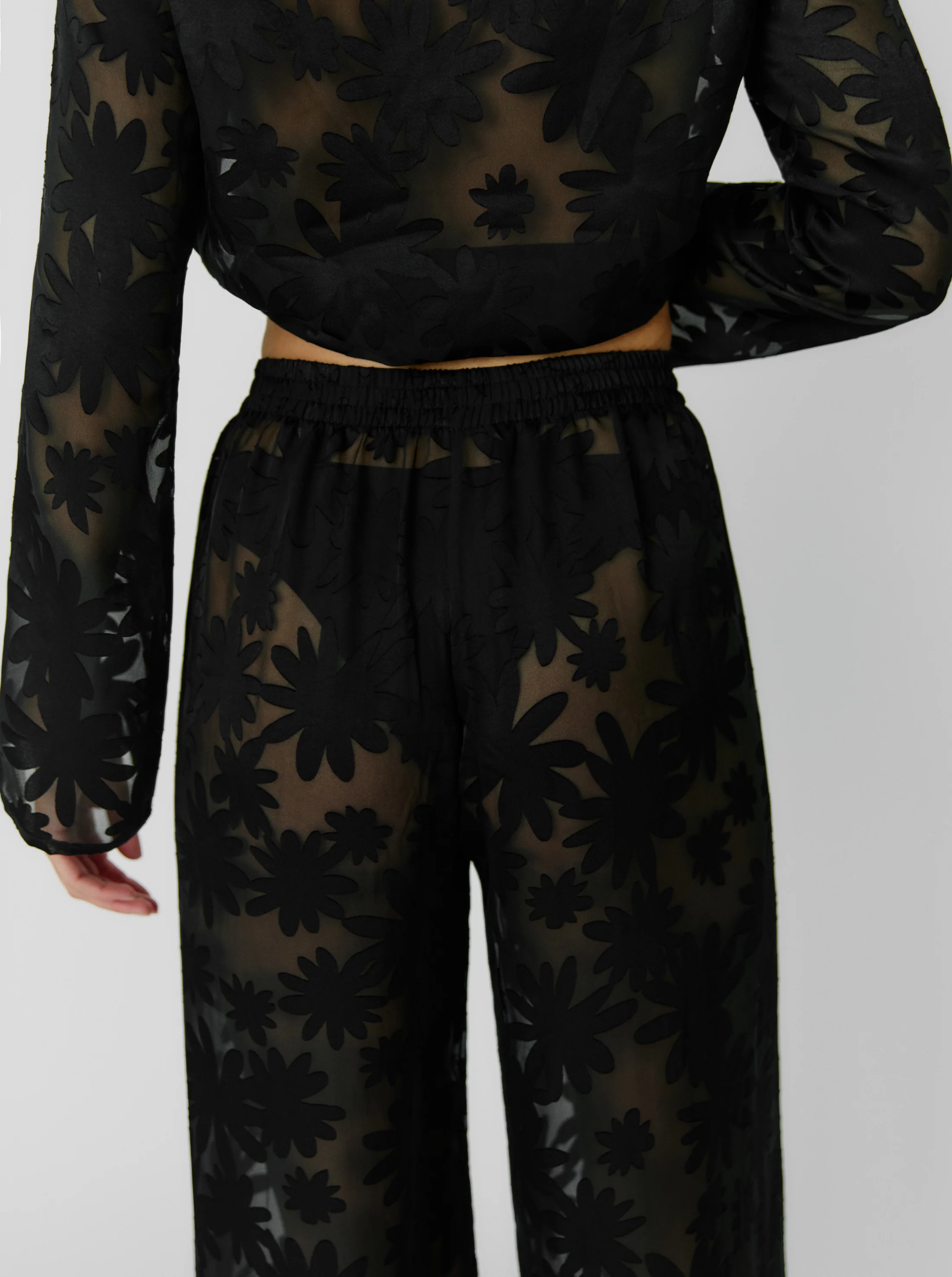 Laurène porte le pantalon SHADOW BLOSSOM avec le top SHADOW BLOSSOM.